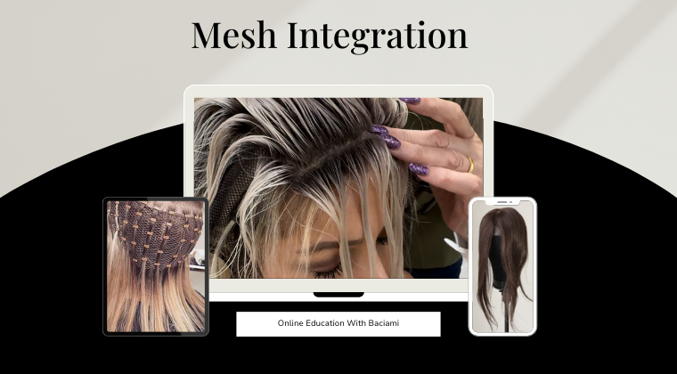 The Online Mesh Integration Course at Baciami is a comprehensive program designed to transform stylists into skilled hair loss and mesh integration professionals, giving them the tools to offer an exclusive, high-demand service.